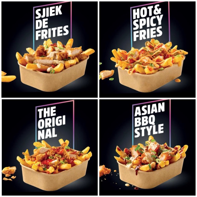 Chopped chicken tenders, warme cheddarsaus, chili saus, kalkoenbacon, geraspte kaas, bosui & krokante gebakken ui.